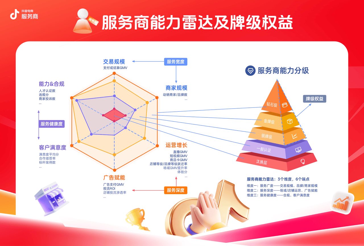 因此,我们看到抖音电商服务商牌级体系中,沿着服务宽度(交易规模、商家规模)、服务深度(广告赋能、运营增长)和服务健康度(能力&合规、客户满意度),持续更新的细分指标。