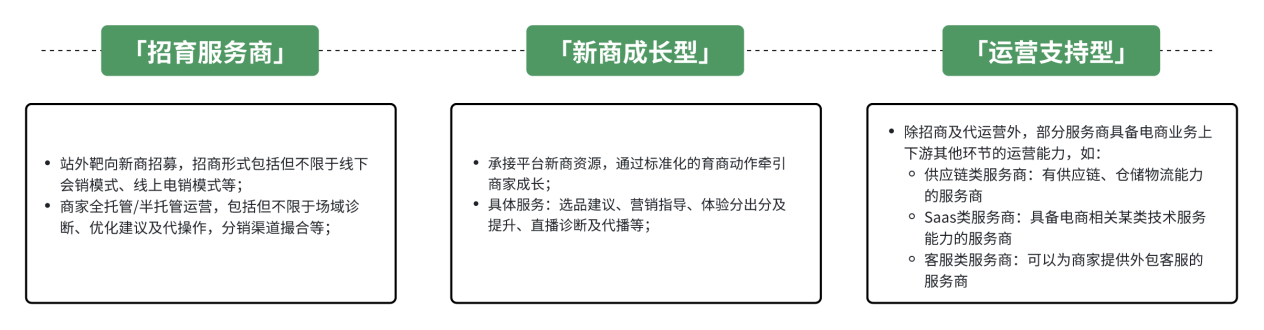 例如在产业带服务商(从开店入驻到长期经营的服务)类型中,抖音电商将服务商划分为“招育运营型”“新商成长型”和“运营支持型”,并设定 GMV 提升、孵化升级商家数、运营商家数等核心目标方向,以及店铺诊断、制定计划和动作拆解的策略指引。