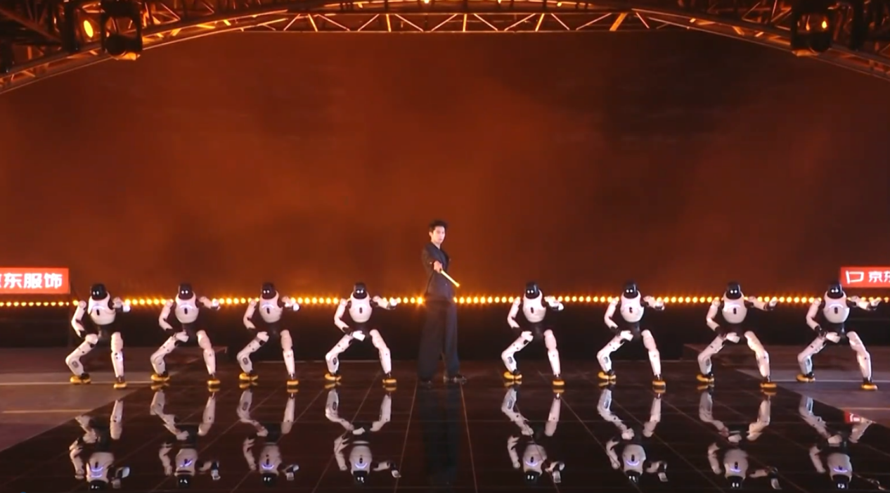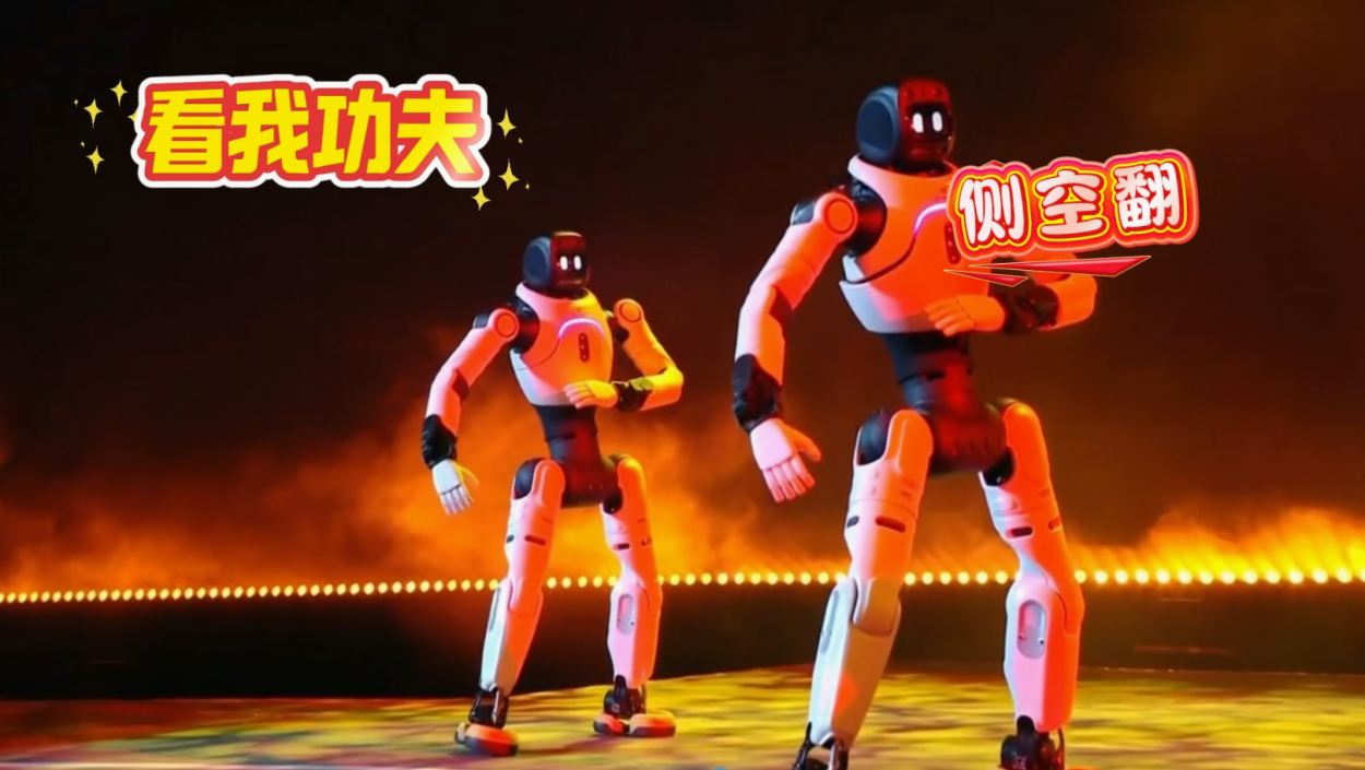 此外,智元机器人还和王鹤棣共同带来节目《闻机起武》,伴随着激昂的《男儿当自强》音乐,灵犀X2和王鹤棣炫酷登场,随后8台灵犀X2连续后空翻、前空翻、踢腿、侧空翻等高难度酷炫动作轮番上阵:凌厉的踢腿动作劲道十足,腿部关节发力精准,尽显力量感;侧空翻时躯体旋转角度丝毫不差,与舞台灯光交织出极具冲击力的视觉效果;前空翻衔接利落;随后精准完成连续后空翻,落地稳稳当当;气势如虹尽显机器人钢铁“真男儿”本色。
