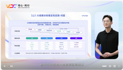 vivo Al工程架构师刘东阳则表示,VTraining训练平台是在容器能力之上构建,支撑vivo手机的蓝心小V等核心产品的大模型训练业务。在大规模训练稳定性实践中,通过减少基础设施高频故障、完善任务故障处置流程两大措施,成功实现了机器每日故障率从2%降低到1‰的突破,千卡任务有效训练时长从60%提升到99%,达到行业一流水平。平台在GPU利用率提升实践中,通过低优任务、训推潮汐部署、GPU虚拟化等策略,深度适配差异化业务场景,实现了资源的高效复用。
