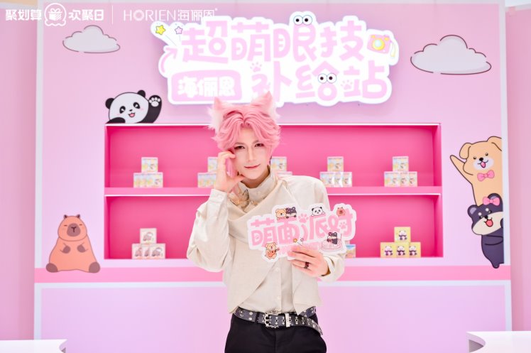 走进派对的第一步,“萌友认证中心” 便为情绪治愈埋下伏笔。用户扫码成为海俪恩会员,领取专属 “萌友护照”,再挑选心仪的萌宠头箍 —— 是活泼的小狗、慵懒的熊猫,还是松弛的卡皮巴拉?戴上头箍的瞬间,仿佛卸下了日常的身份标签,化身纯粹的 “萌友”。活动中,在海俪恩邀请了多位人气嘉宾担任 “一日店长”,他们不仅佩戴 “萌生宠爱系列” 彩瞳 COS 成萌宠角色,还在现场与用户互动合影并分享 “显眼” 心得。